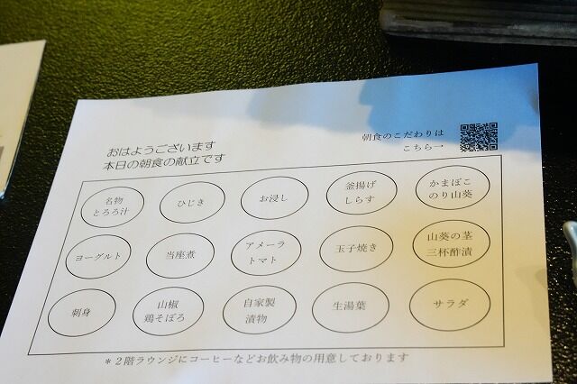 2025年11月14日 本日の朝食の献立 今回の旅行のお宿は静岡県伊豆の国市古奈の富嶽 はなぶさ さん楽しみにしていた、朝食。トマトジュース本日の朝食の献立選べるメインは、アジの干物と鳥の煮物。かまぼこ のり山葵山葵の茎 三杯酢漬サラダ釜揚げしらす玉子焼き生湯葉お浸しアメーラトマト自家製漬物ひじき当座煮山椒鶏そぼろ名物とろろ汁ヨーグルト刺身せいろ蒸しいちばん美味しかった名物とろろ汁ご馳走様でした。美味しかったです。_( ̄▽ ̄)ノ彡☆富嶽 はなぶさ静岡県伊豆の国市古奈407ブログランキングに参加しています。ポチッとして頂けると、嬉しいです。 「グルメ」カテゴリの最新記事 < 前の記事次の記事 > コメント コメントフォーム 名前 コメント 記事の評価 リセット リセット 顔 星 情報を記憶 コメントを投稿する